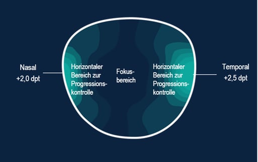 Die Bereiche zur Progressionskontrolle sind seitlich an den MyCon Gläsern angeordnet. So platziert, verlangsamen sie das Fortschreiten der Myopie am besten, beeinflussen die Hauptsichtfelder nicht und gewährleisten scharfes Sehen. Auch wenn sie an den Seiten die Sicht etwas verschwimmen lassen, sind die horizontalen Bereiche zur Progressionskontrolle bei den MyCon Gläsern entscheidend, um das Fortschreiten der Myopie zu kontrollieren.